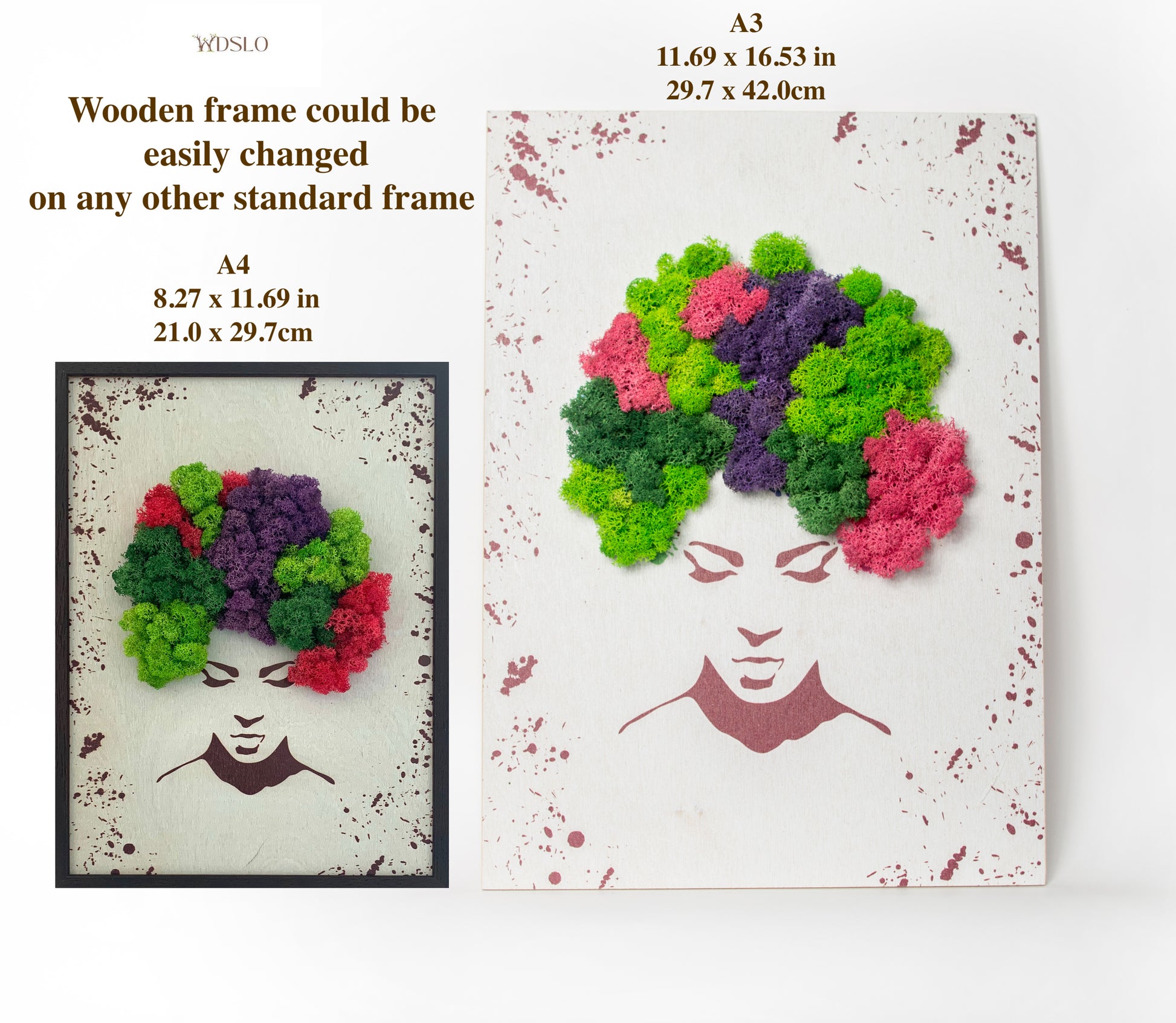 This Mixed Moss Female Hair Wall Art is a breathtaking tribute to natural beauty and artistic expression. The combination of reindeer moss in varying shades of green, purple and pink creates a rich, textured hairstyle, giving the artwork depth and realism.