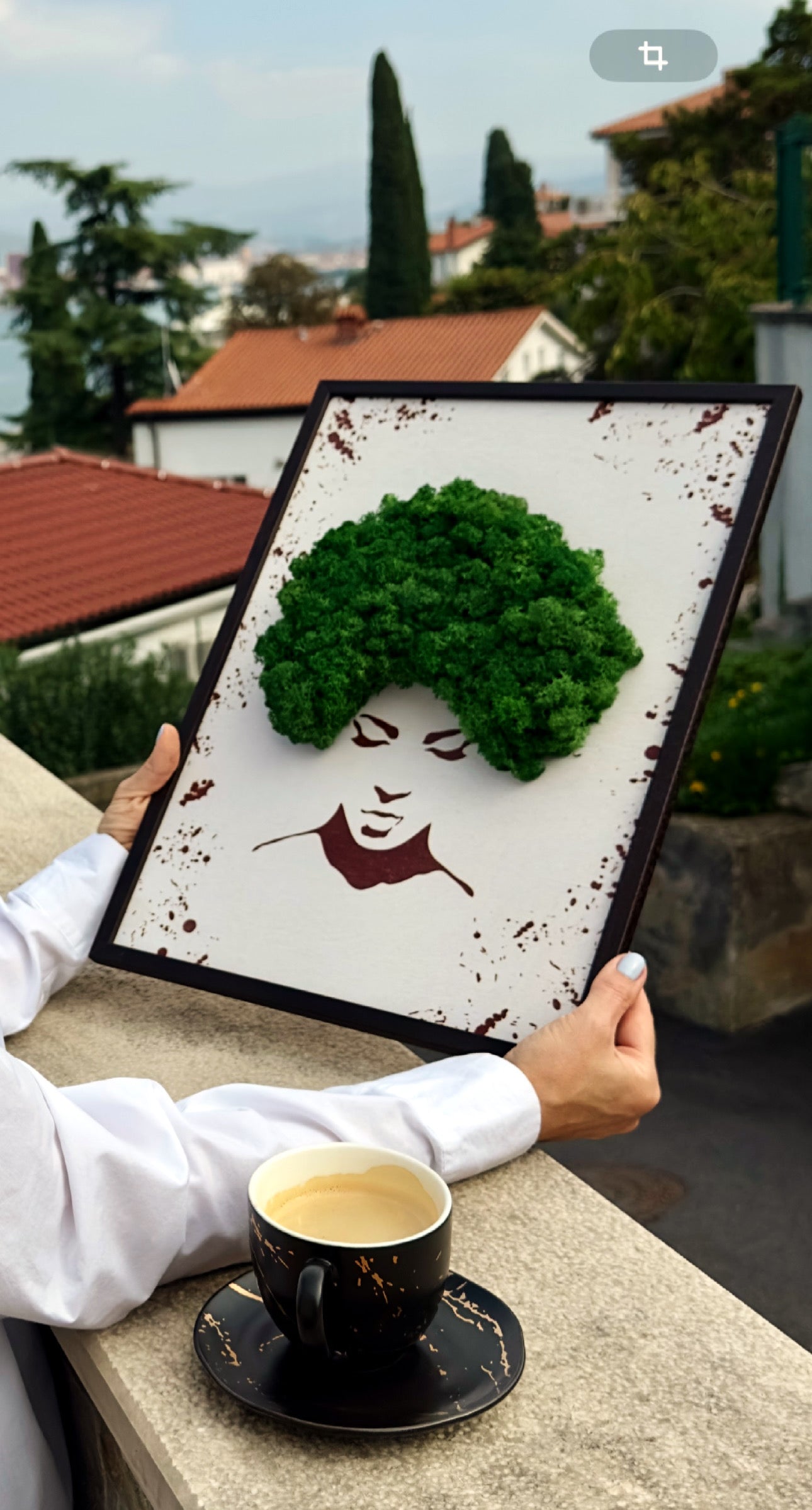 Stenska umetnost iz zelenega mahu "Ženski obraz" na leseni podlagi