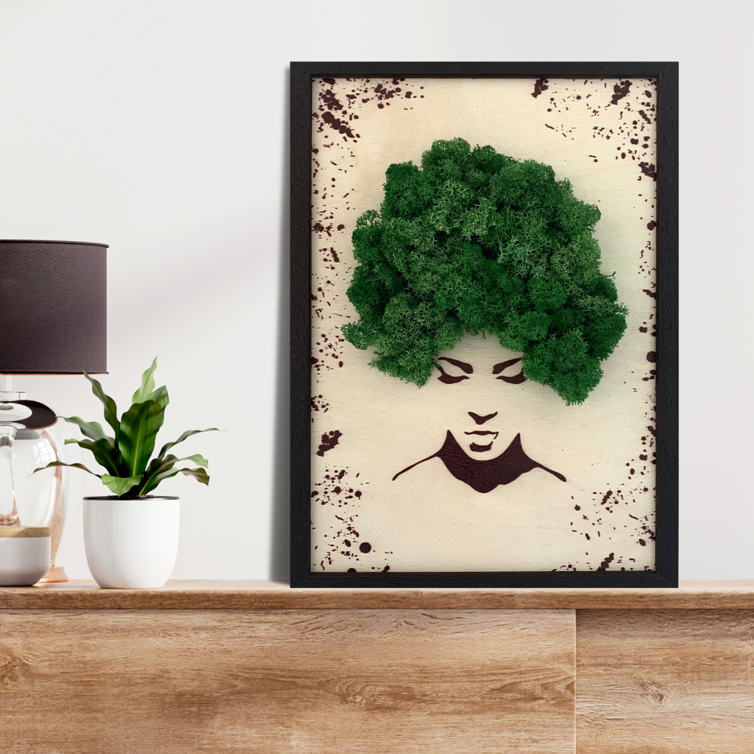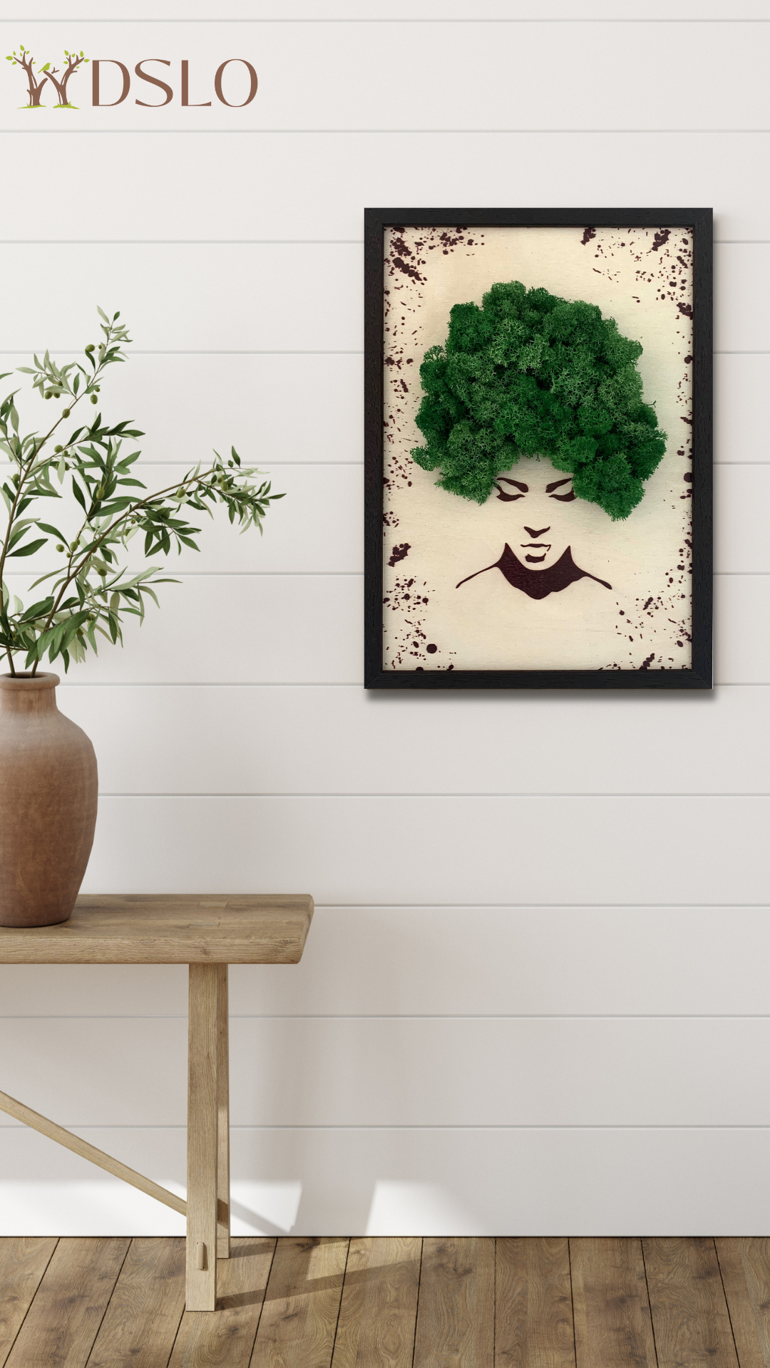 V svoj prostor vnesite naravno eleganco in umetniško lepoto s to edinstveno stensko umetnino iz mahu, ki prikazuje ženski obraz z zelenimi lasmi, prekritimi z mahom .